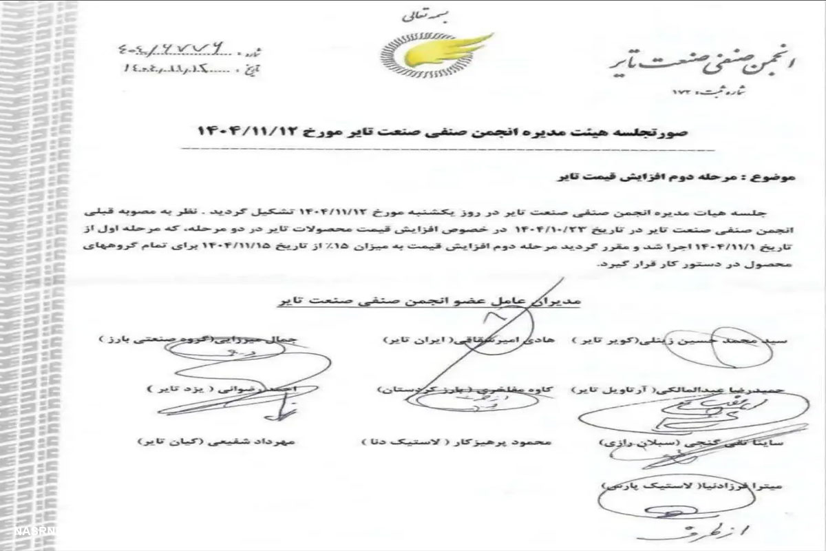 به گزارش تریبون تبریز، بر اساس صورتجلسه هیئت مدیره انجمن صنفی صنعت تایر در خصوص مرحله دوم افزایش قیمت تایر برای تمام گروهای محصول که به امضای مدیران عضو انجمن صنفی رسیده است، مرحله دوم افزایش قیمت تایر به میزان ۱۵ درصد از پانزدهم بهمن ماه (فردا چهارشنبه) برای تمام گروههای محصول در دستور کار قرار میگیرد.